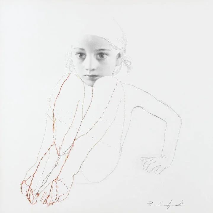 Martin Javier Palottini (b. 1981, Buenos Aires) is an Argentinian artist who mainly works in drawing. Paolottini’s work is outstandingly physical; from vast interlacing flat tints arise flawless faces and bodies, a testimony to perfect realism that reveals unadulterated beings. In the style of a collage artist, Pallotini surrounds and extends his subjects with graphic and plastic elements; clues that offer glimpses of hidden souls beneath overly polished beauty. Paper turns to skin; a fragile material in turns stitched with fine scars or surging in vivid flashes of light, to match the cracks and glories that inhabit his subjects’ inner landscapes.