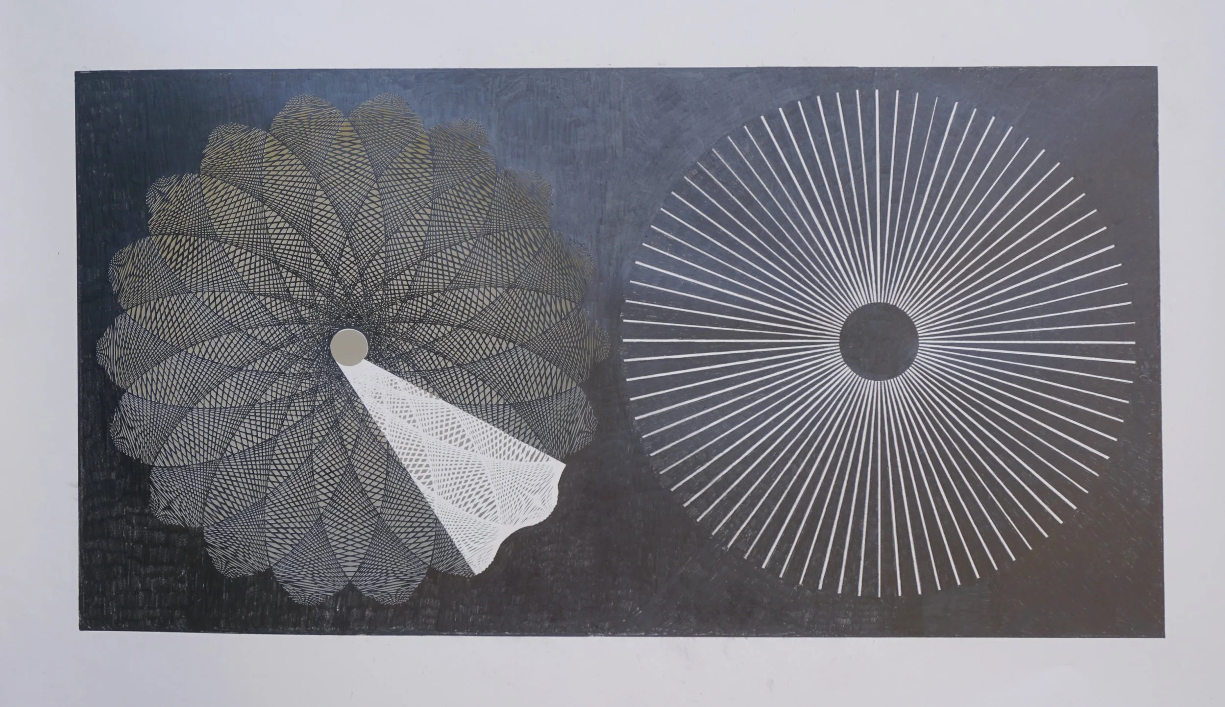 In this show, Pehrson delves into the mysteries of the night sky. His pursuit is not a literal charting of planets and stars, but rather a meditation on the human obsession with patterns in the natural world and a celebration of our search for meaning in the farthest parts of the unknown. The spirographic shapes in his work are reminiscent of the oscillating paths of celestial bodies across the sky, plotting out both mathematical formulas and mystical truths that are just out of reach. While not an active practitioner of astrology, Pehrson is interested in the concept of large-scale movements in space and time exerting influence on our free will.
