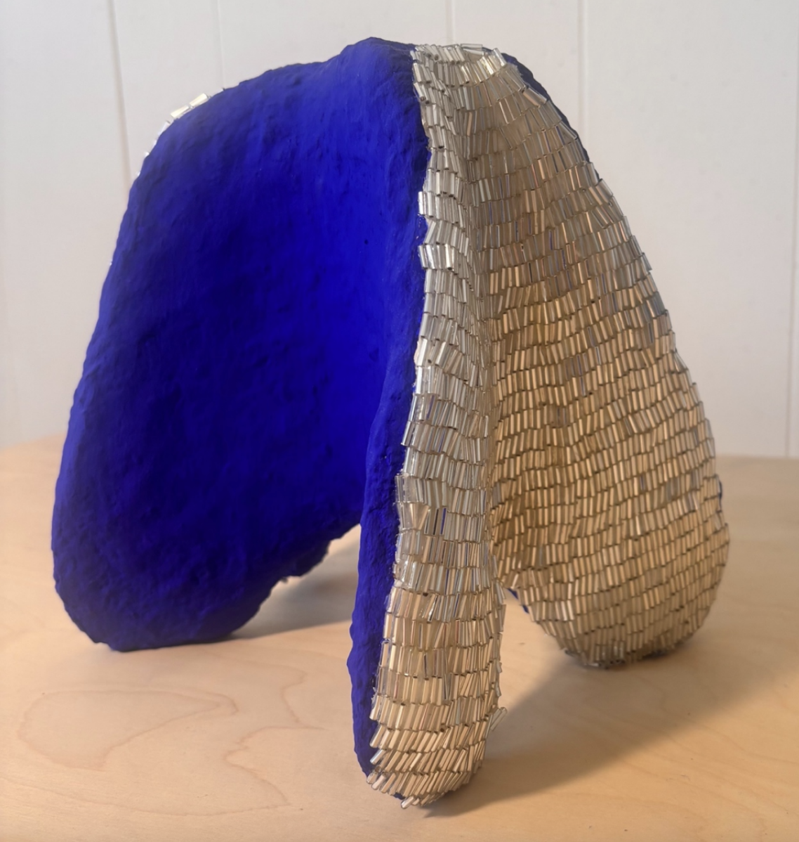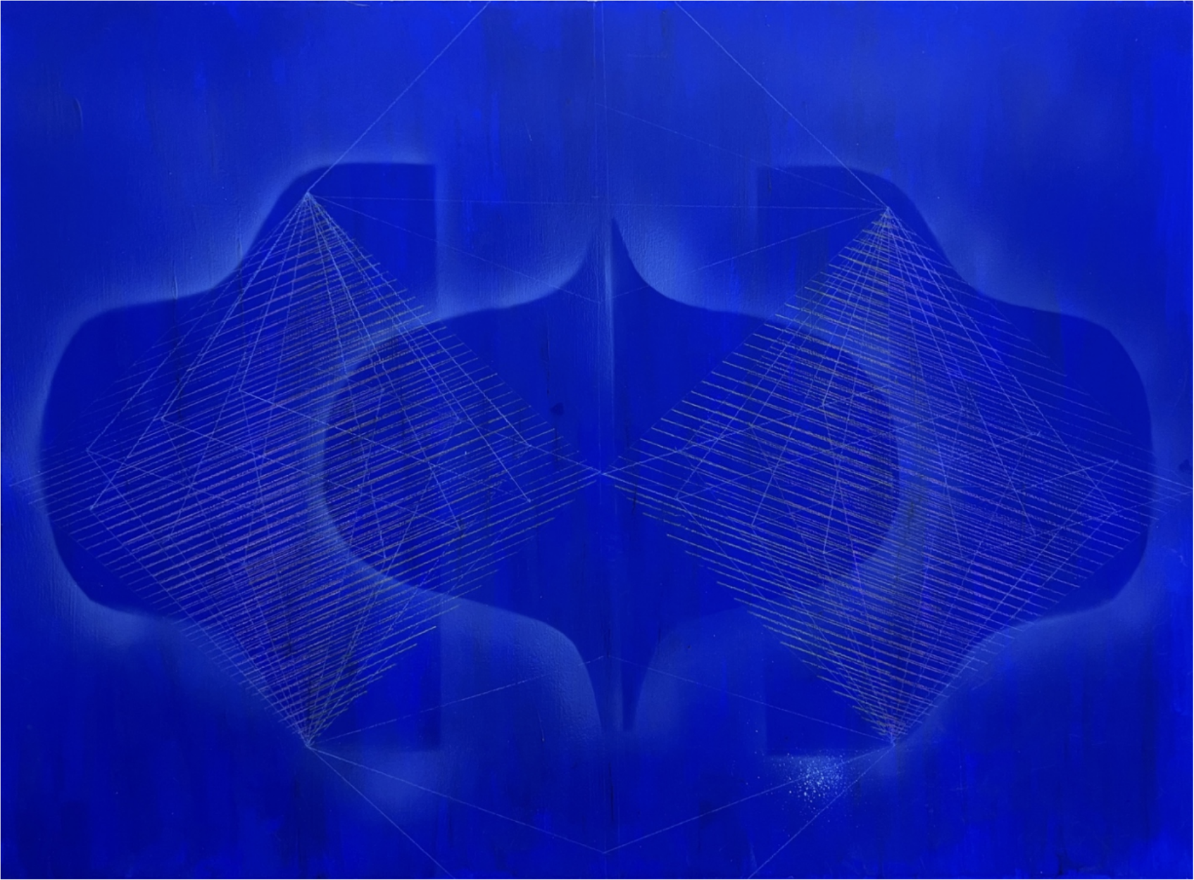 Becoming Light transports viewers into a realm of essential geometry. Gertler investigates how a single form can evolve through varied techniques, grids, and linework. With each iteration, the experience subtly shifts, echoing a sense of deep calm. Repeated cubes and bells in lush jewel tones form a visual language, as if mapping metaphysical, psychological, or emotional terrain. Airbrushed shapes hum with resonance, while color field backgrounds, upon closer inspection, reveal finely drawn colored pencil lines—tightly woven like piano strings, lending visual harmony. In Gertler’s sculptural works, the audible becomes tactile: clay, beads, and gemstones emphasize texture and tone. Earthy clays blend with the crystalline geometry of stones to compose a new kind of music. Across media, Gertler channels sensory elements to evoke tranquility and introspection.