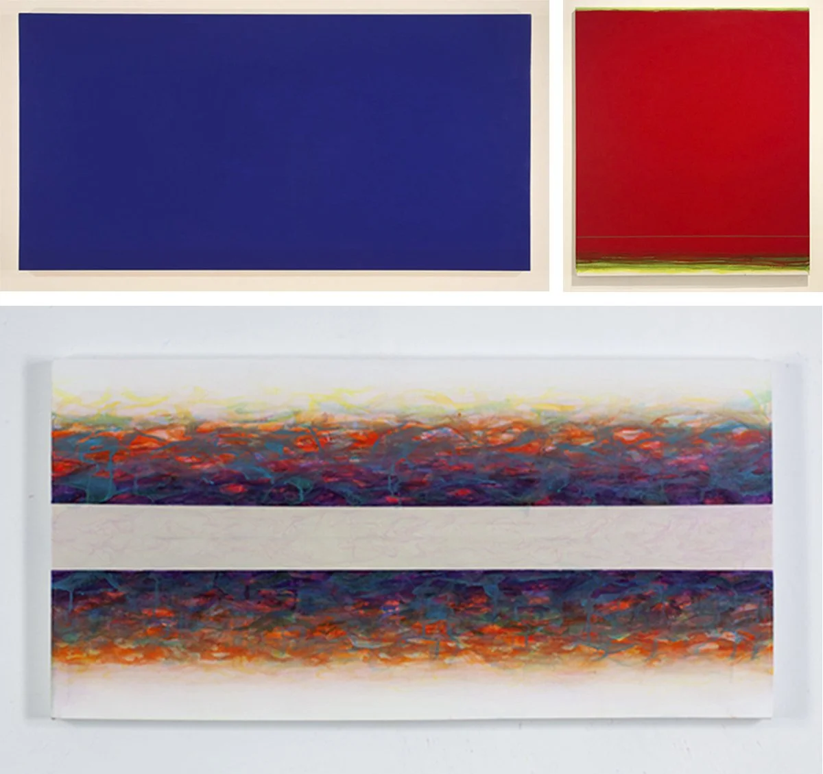 Shingo Francis, Blue’s Silence (still silence), 2007; Infinite Space (scarlet-yellow) 2018; Open Space II, 2010; all works © Shingo Francis