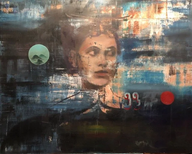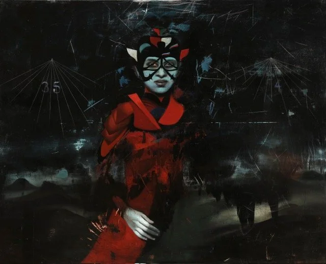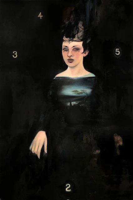 Most of the paintings here feature the head and/or upper torsos of elaborately costumed female figures centrally placed in a shadowy picture space, occasionally surrounded by cryptic insignias painted with old-timey drop shadows. The series is titled “Imogene,” a salute to his wife Imogene Chayes. Chayes is a self-described concept artist of some renown, working with costume creation in the film and television industry. This fact registers in the many ways that Macnee portrays her throughout the series. From painting to painting, Chayes is portrayed in guises ranging from Esther Williams-era swimwear to a lady in waiting at the sixteenth century Spanish court. In one work she appears as a fictional queen of outer space rescued from vintage science fiction illustrations.